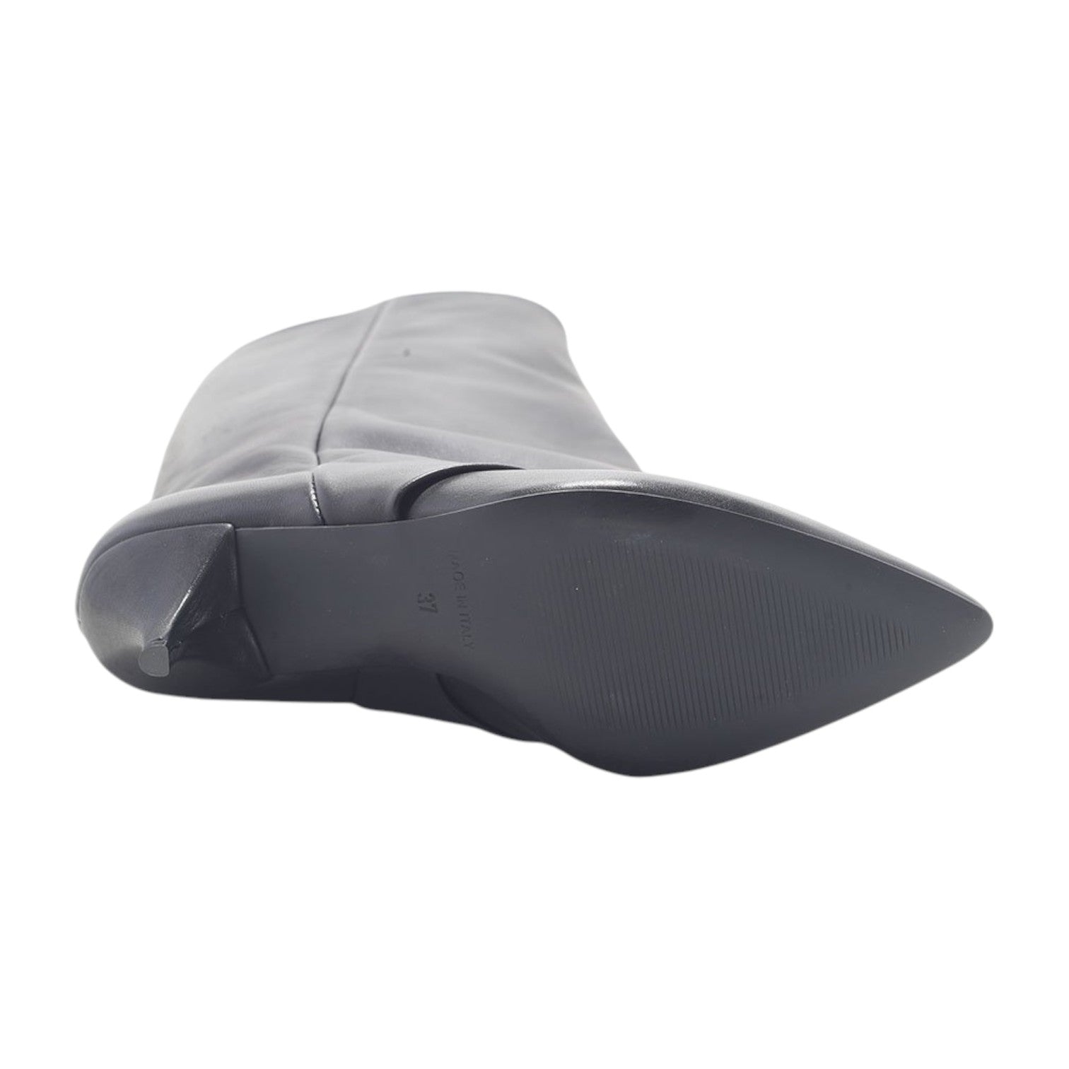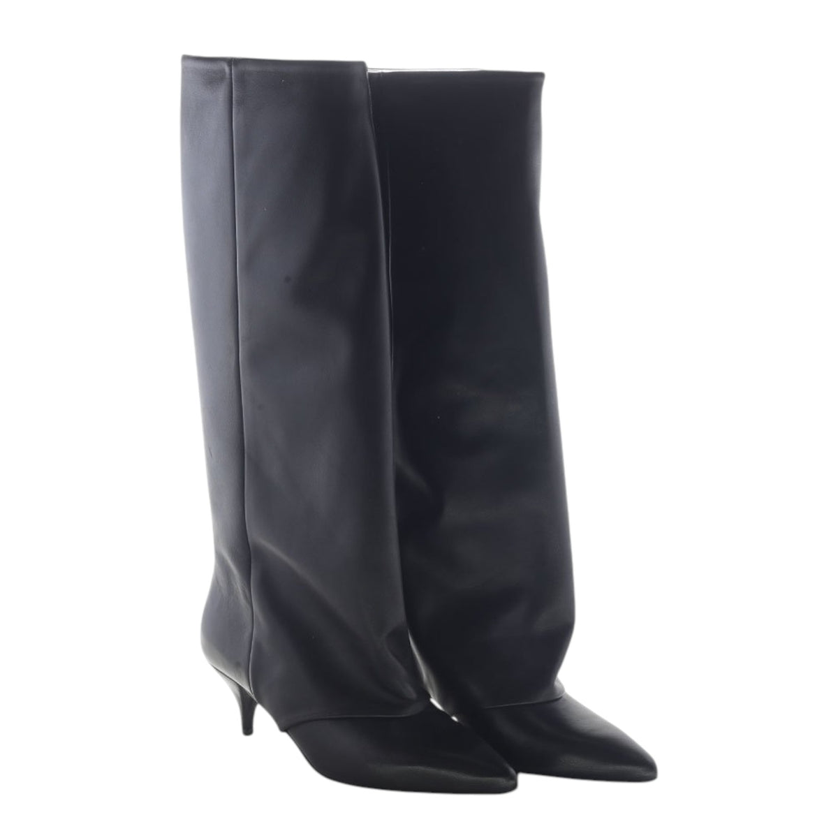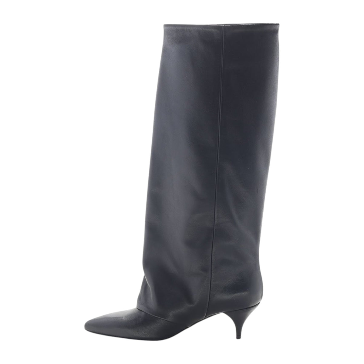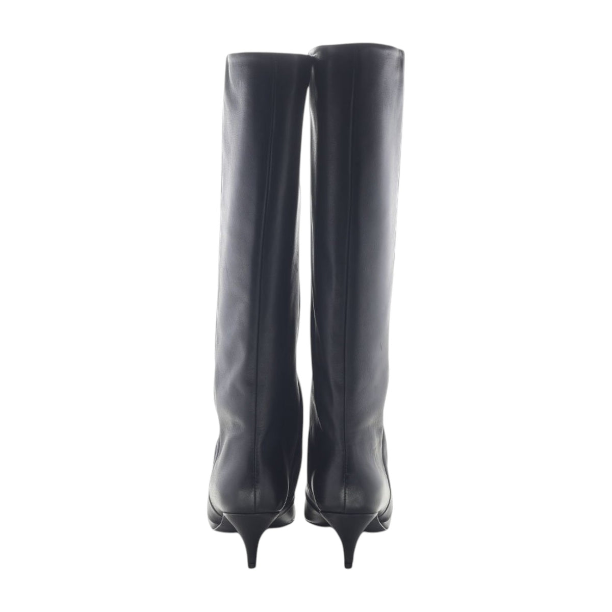 Lo Stivale firmato The Icona, ridefiniscono il concetto di eleganza minimale. Realizzato in morbida pelle nera con finitura liscia e punta affusolata per una silhouette slanciata e femminile, sono caratterizzati da un gambale alto dal design strutturato e un raffinato tacco basso a rocchetto, perfetto per slanciare la figura con discrezione.