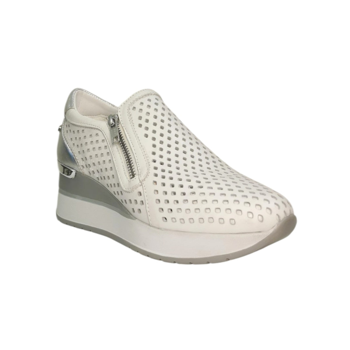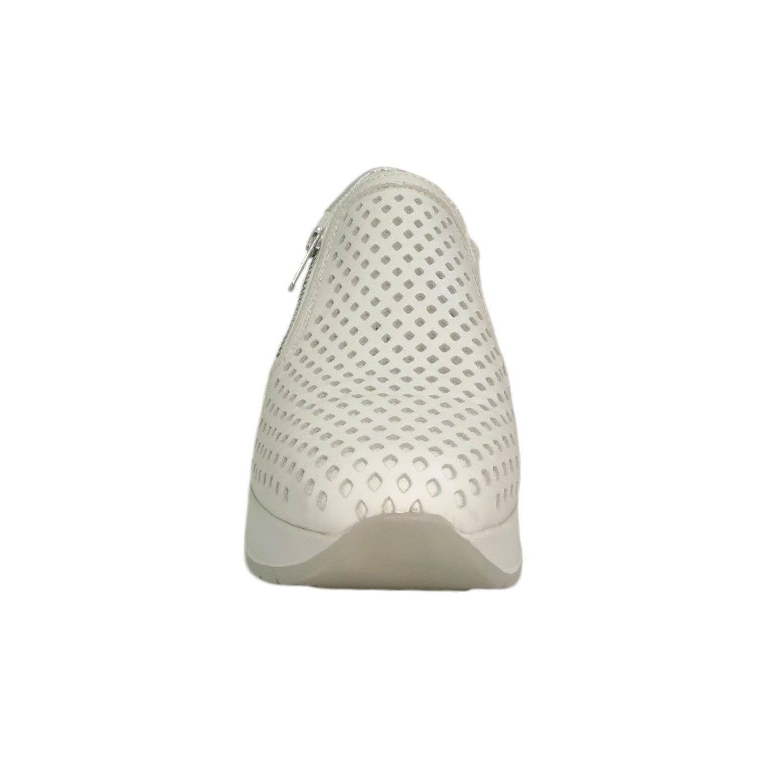Il Mocassino firmato Valleverde, realizzato in pelle bianca traforata è dotata di zip sul davanti che permette di indossarle in modo pratico e veloce e la zeppa interna è molto leggera e regala centimetri alla figura senza affaticare la camminata.