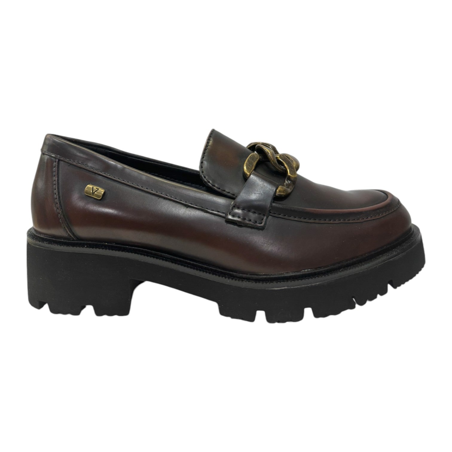 Il Mocassino firmato Valleverde, realizzato in pelle marrone è caratterizzato da una suola a carrarmato alta 4cm e da catena frontale color bronzo, l'interno è foderato in tessuto caldo imbottito con sottopiede in pelle.