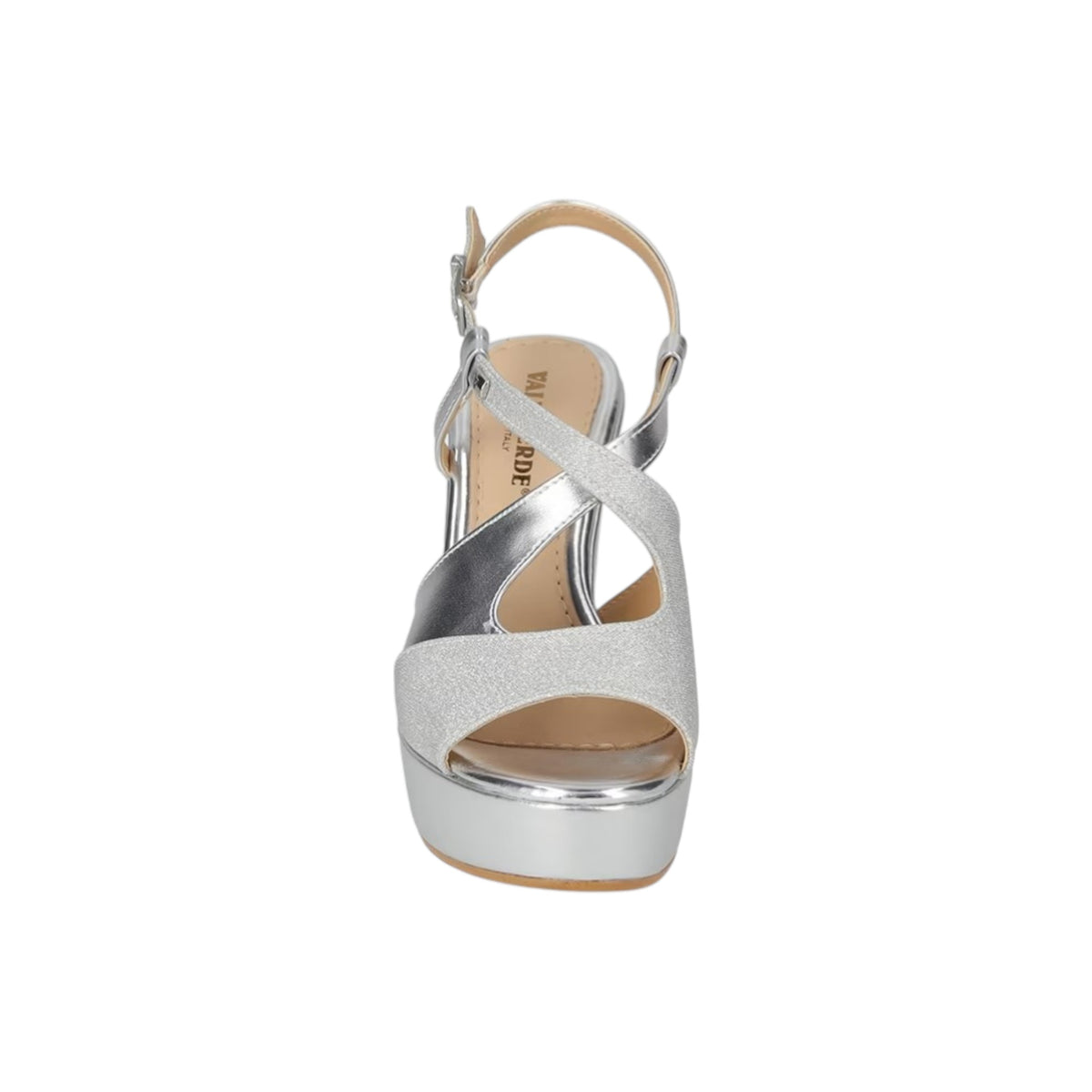 Il Sandalo firmato Valleverde, incarna l'eleganza senza tempo, realizzato in ecopelle laminata argento è caratterizzato da inserti in tessuto lurex che donano luce e da una comoda chiusura con cinturino con fibbia, il plantare è rivestito in pelle che garantisce comfort e supporto per tutta la giornata.