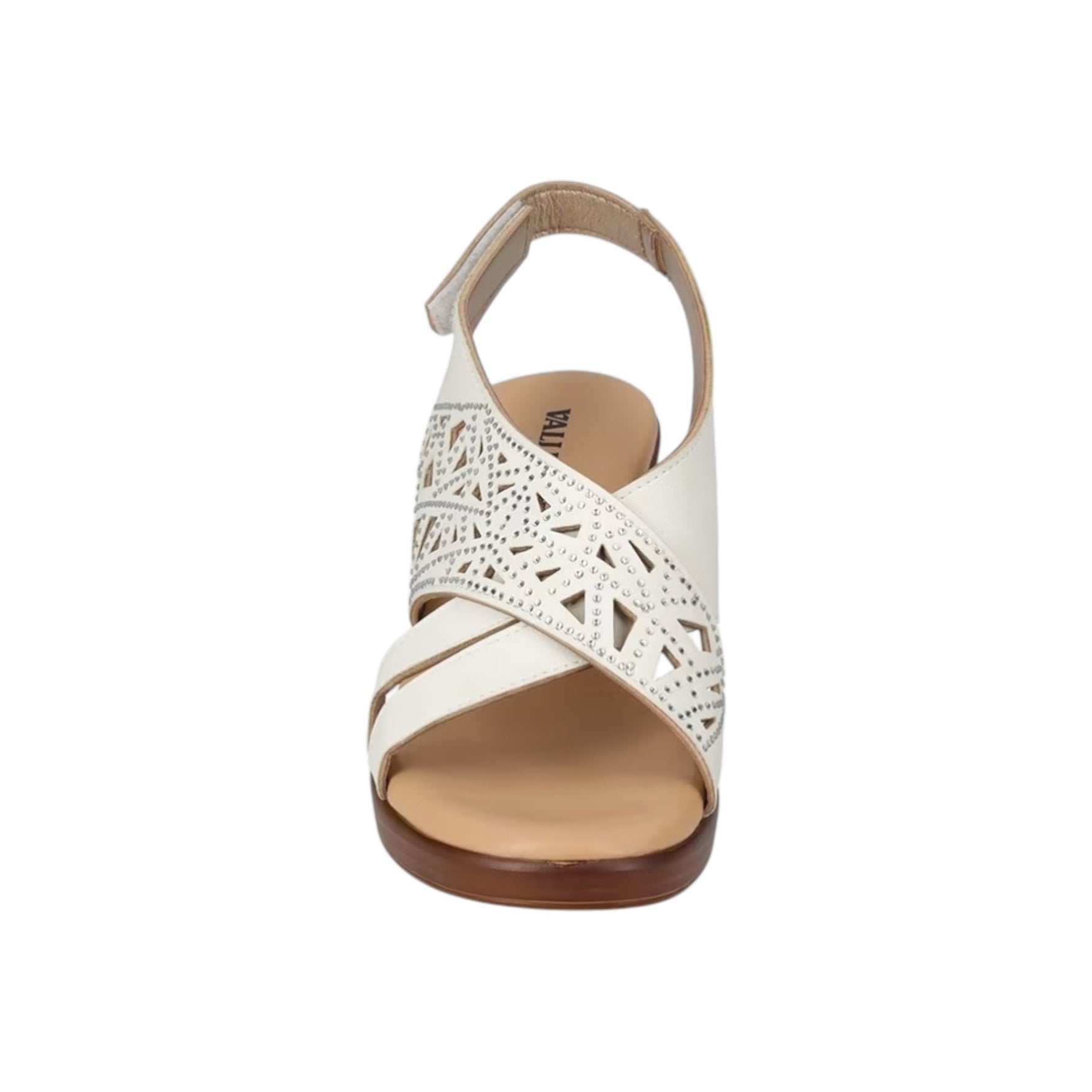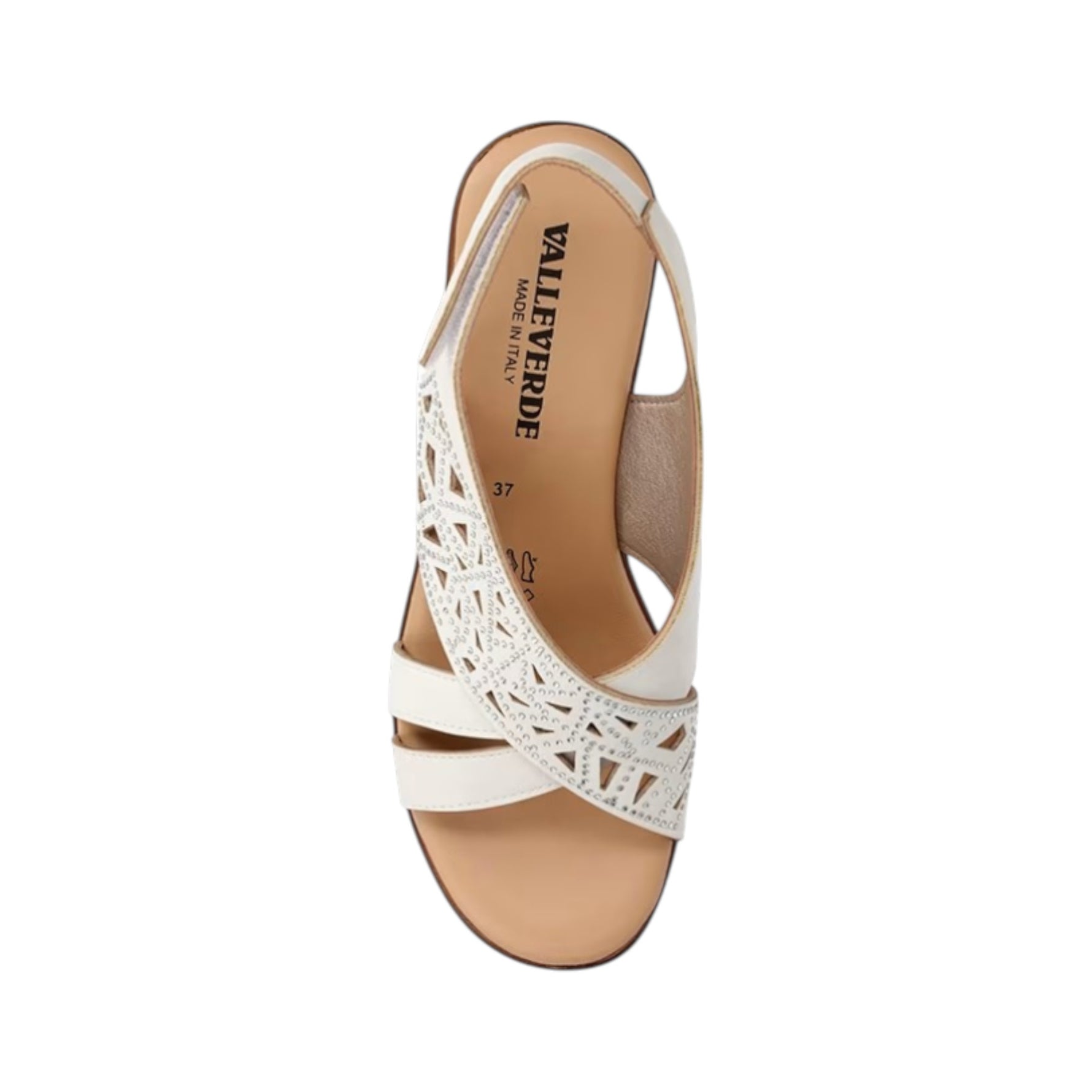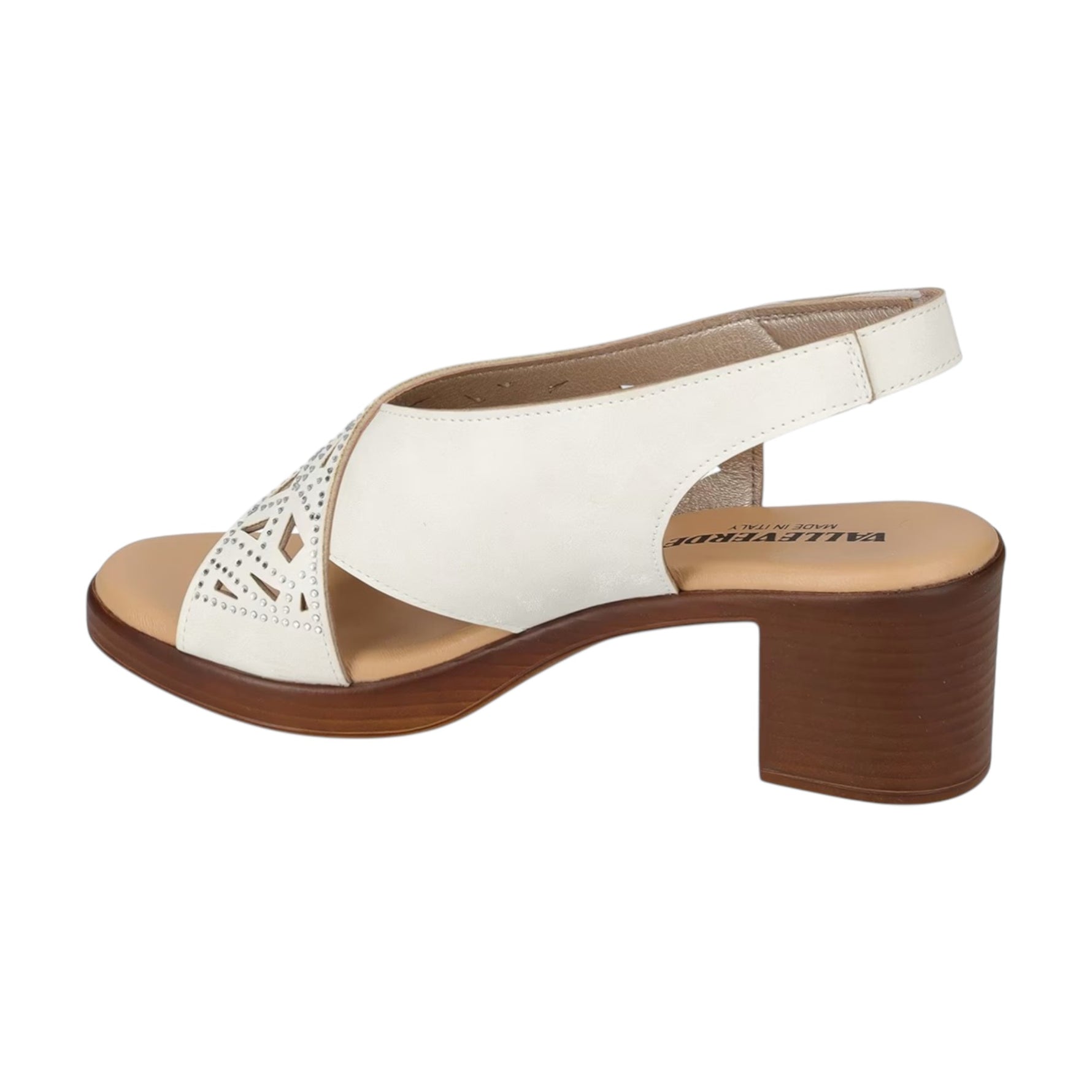 Il Sandalo firmato Valleverde, realizzato in ecopelle avorio è caratterizzato da una lavorazione traforata con mini strass che donano luce e da una comoda chiusura con strappo, il plantare è rivestito in pelle e ed infine presenta un tacco alto 6cm effetto legno, che offre al tempo stesso equilibrio e sicurezza.