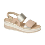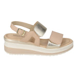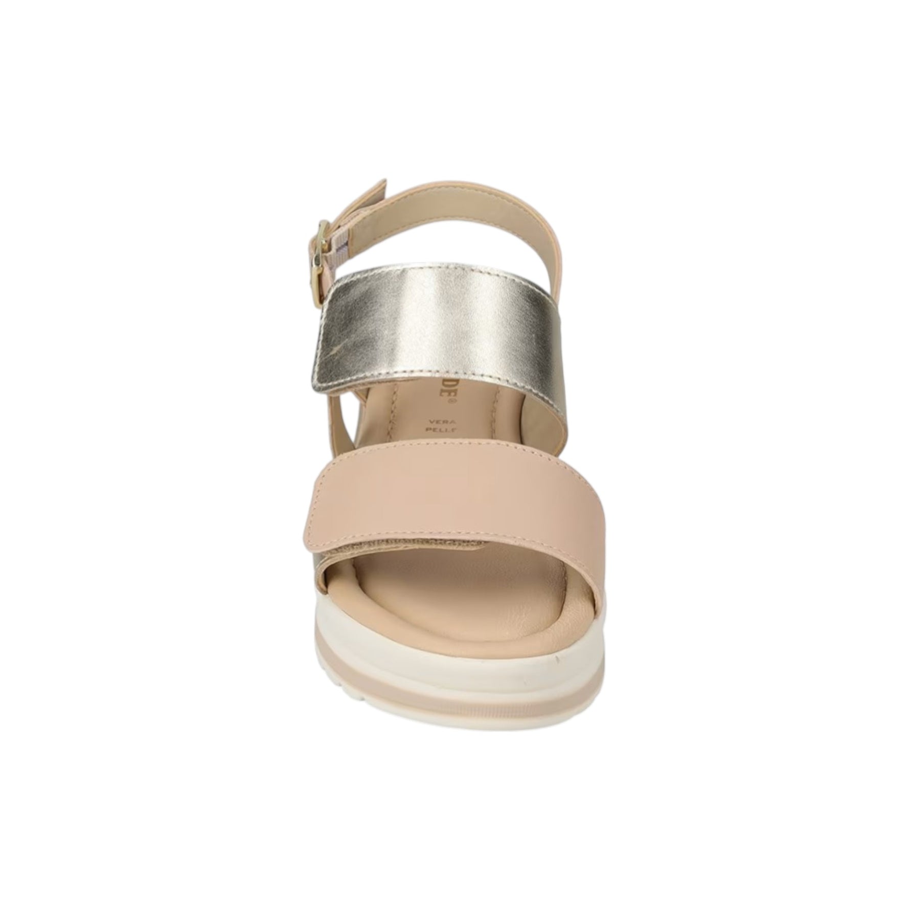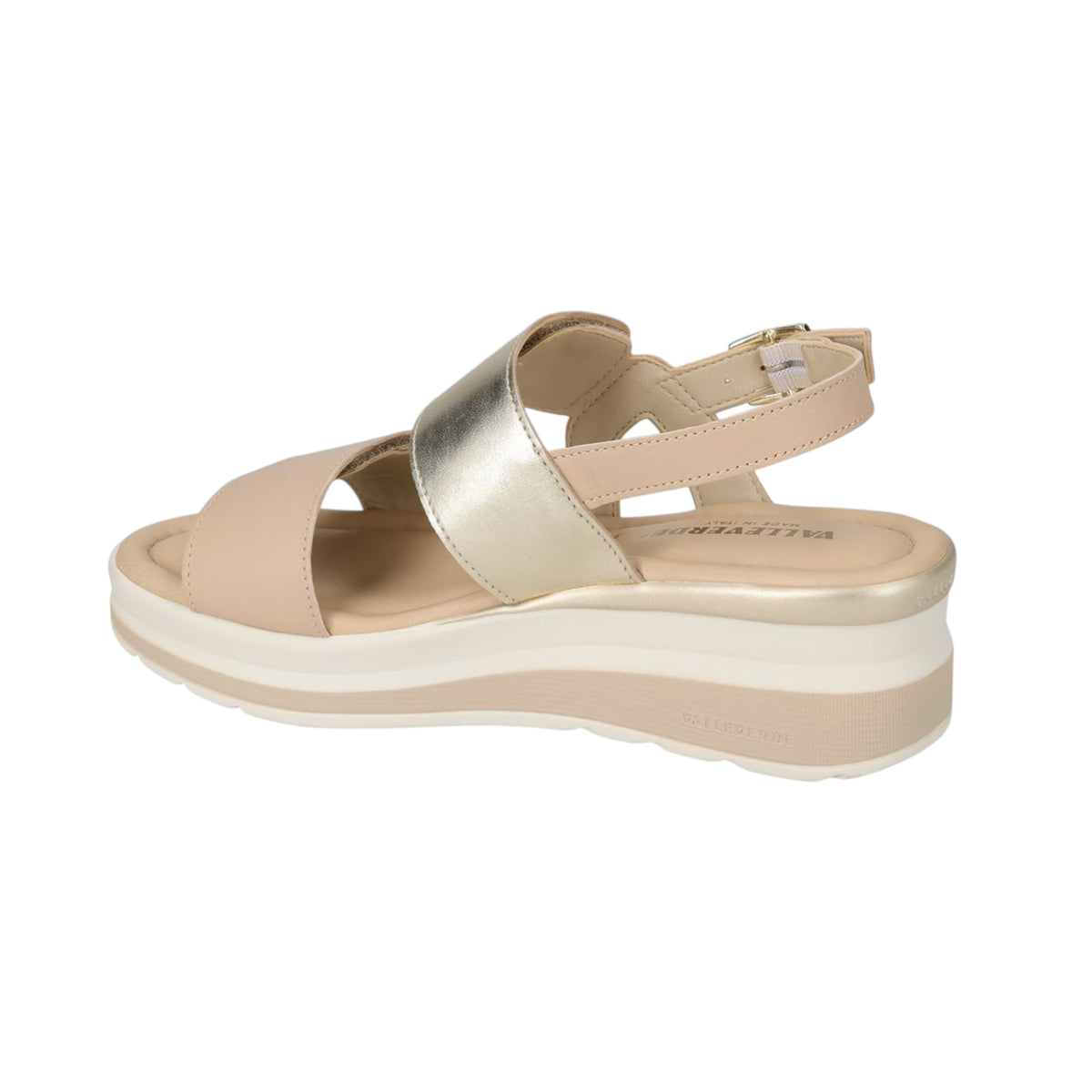 Il Sandalo firmato Valleverde, una calzatura versatile e di tendenza, realizzato in pelle è caratterizzato da cinturino regolabile alla caviglia con fibbia dorata e inserti oro laminato, con doppi strappi, e da zeppa alta 5,5cm, il plantare in pelle garantisce comfort tutto il girono.