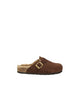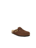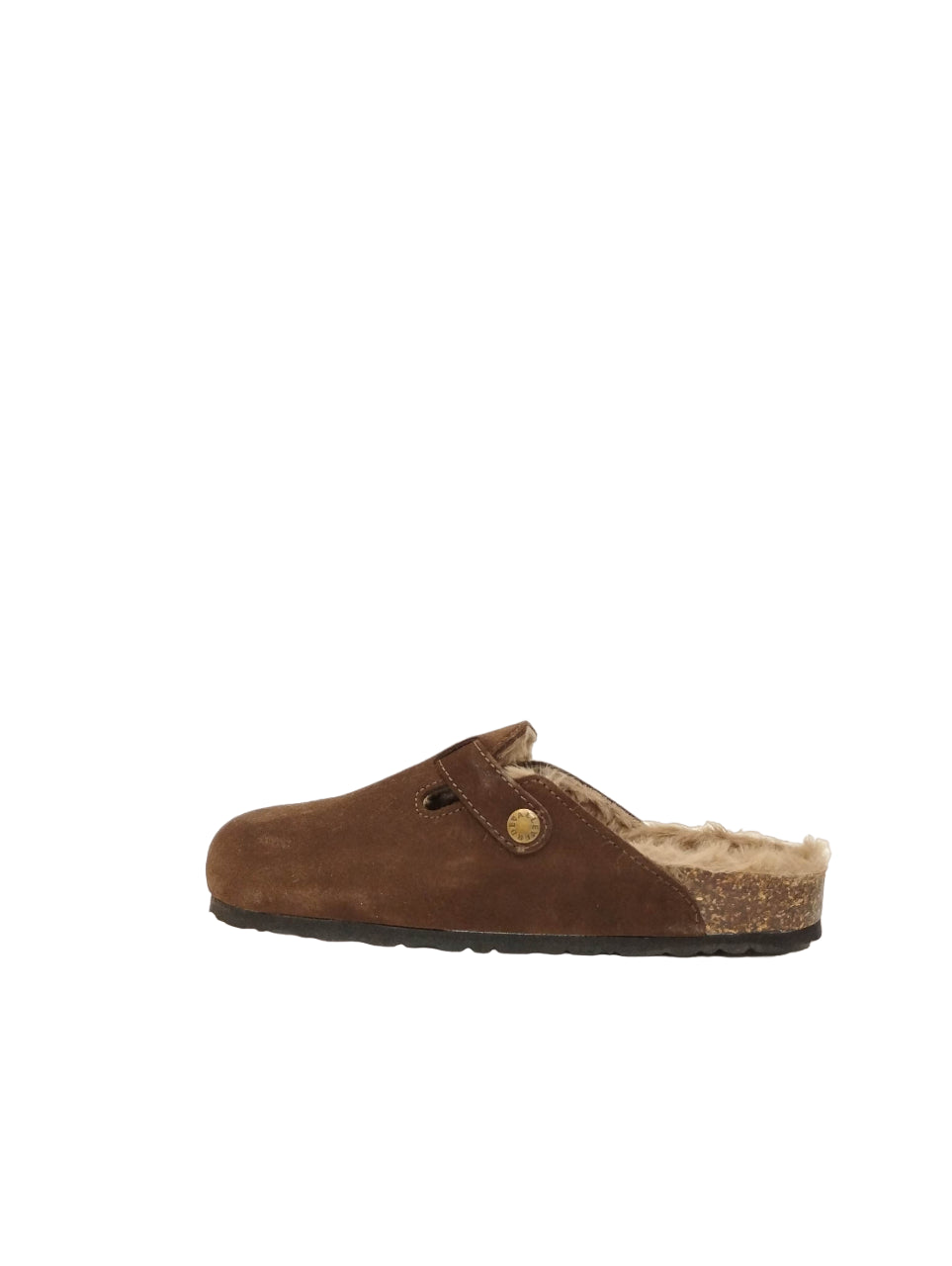 Sabot firmato Valleverde, realizzato in camoscio è caratterizzato da una chiusura con fibbia regolabile sul collo, con sottopiede ed interno rivestiti in pelliccia sintetica e suola in sughero di 2 cm con fondo gomma.