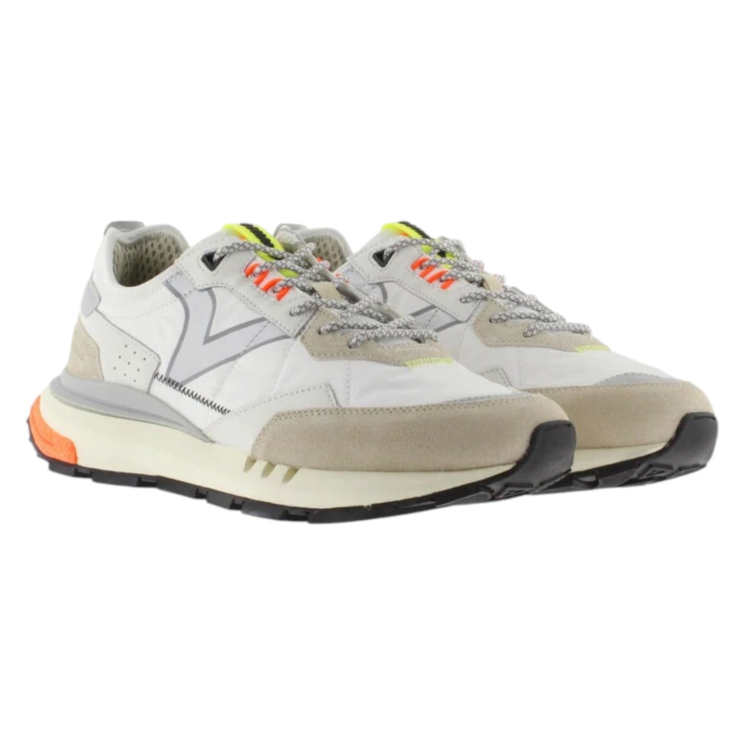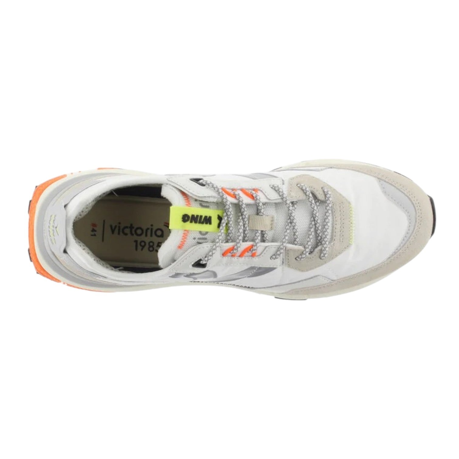 La Sneakers firmata Victoria, realizzata in nylon fine "effetto piuma" con pezzi sovrapposti in camoscio e dettagli in PU. V retro di victoria in TPU transfer laterale. La suola bicolore con base in gomma e design ergonomico garantisce una presa ottimale su qualsiasi superficie, mentre il plantare in schiuma offre un'ammortizzazione leggera per una camminata confortevole.